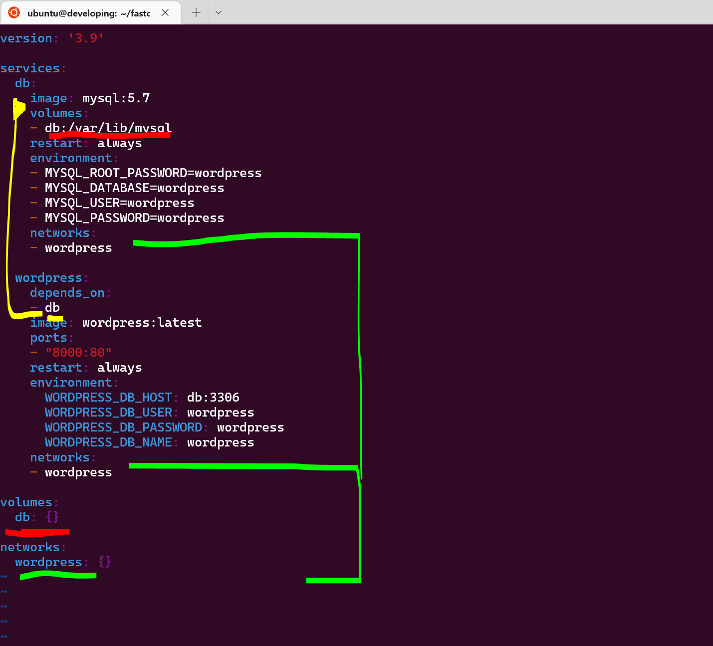 해당 docker-compose 파일을 보면 version,services,networks,volumes 4가지 최상위 옵션이 모두 있다. service로는 db와 wordpress service가 있다. volume은 db 서비스에 mount 되어있는 것을 확인할 수 있고, networsk로는 wordpress가 만들어져있어서 각각의 서비스에 연결되어있는 것을 확인할 수 있다.