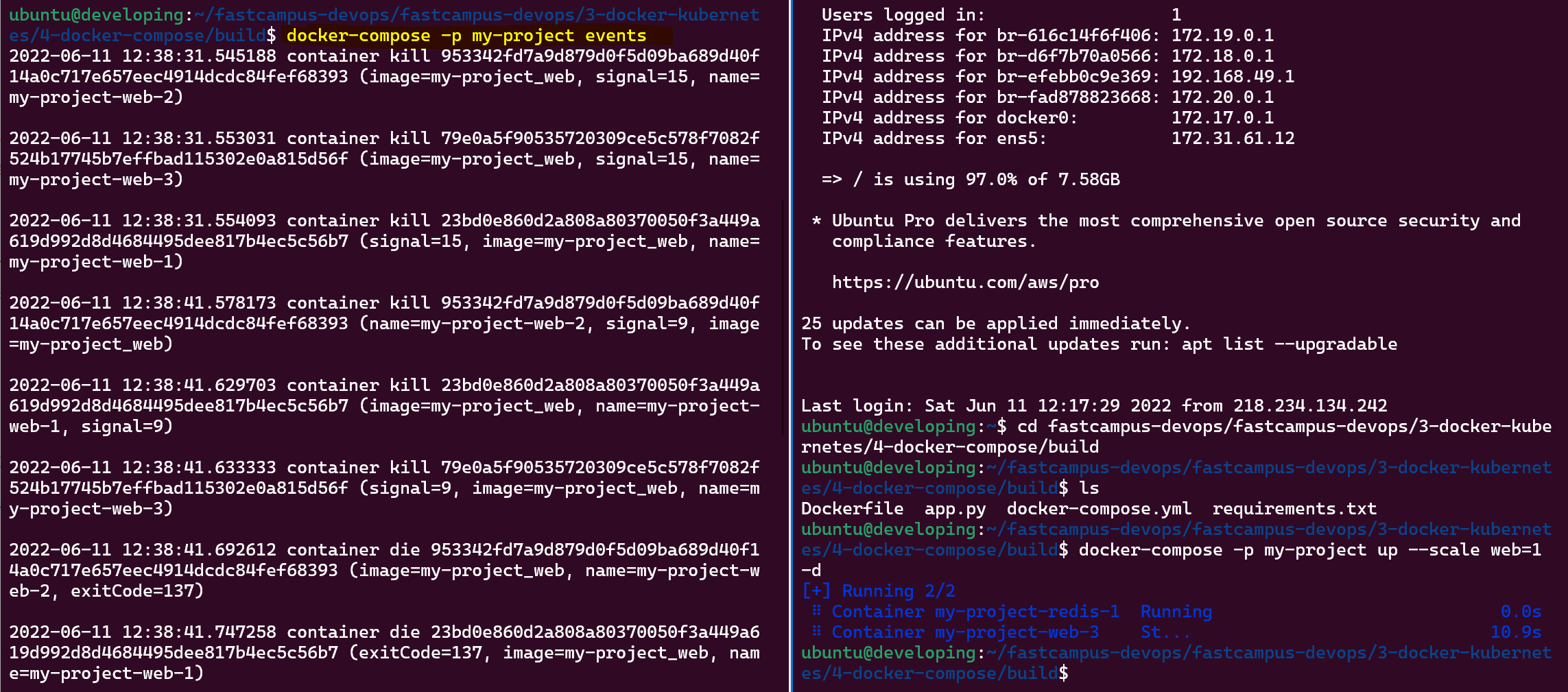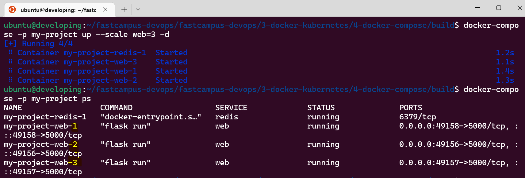 - scale을 통해 서비스 컨테이너의 수 확장 가능