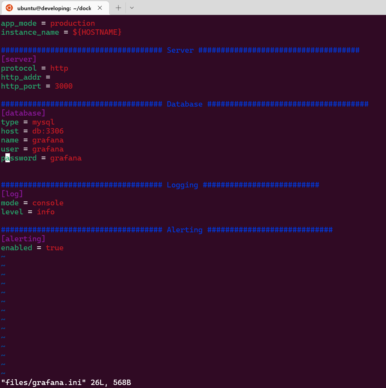 etc/grafana/grafana.ini 는grafana 컨테이너가 기본적으로 불러들이는 grafana의 설정파일이 위치한 위치의 파일이다. 이것을 host상의 files/grafana.ini로 읽기전용 마운트 시키는 것을 확인할 수 있다.