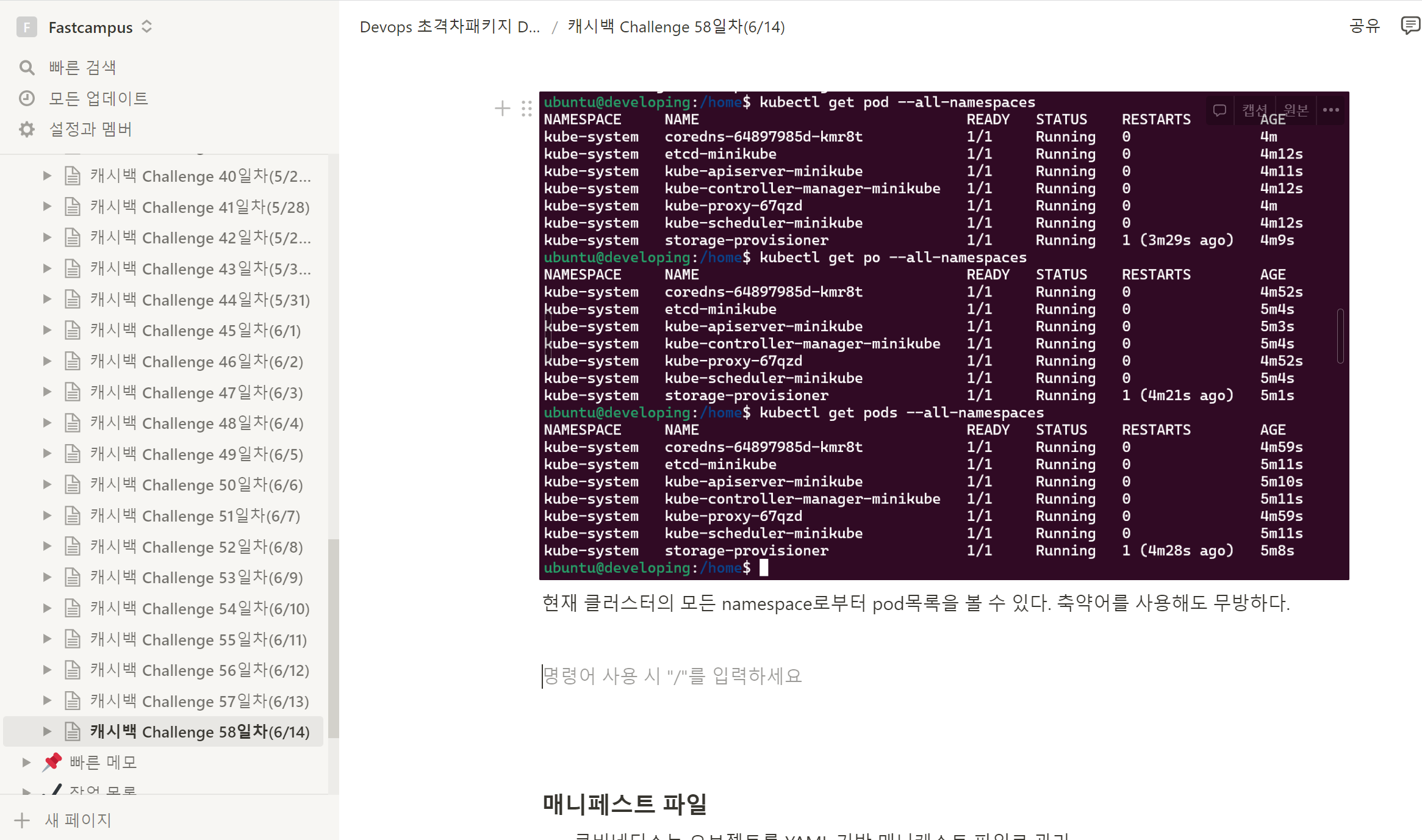 Kubernetes cluster 구성요소와 API resource 관련된 내용의 클립들을 수강하는식으로 챌린지를 진행하였다. kubectl explain 명령어로 각 API 리소스에 대해 알고싶을때 확인할 수 있다는 것도 알게되었고, manifest 파일의 Rootkey가 각각 어느 용도로 사용되는지도 알 수 있었다. 다음 포스팅으로는 kubectl 명령형과 선언형 방식과 관련된 내용을 포스팅할 예정이다.