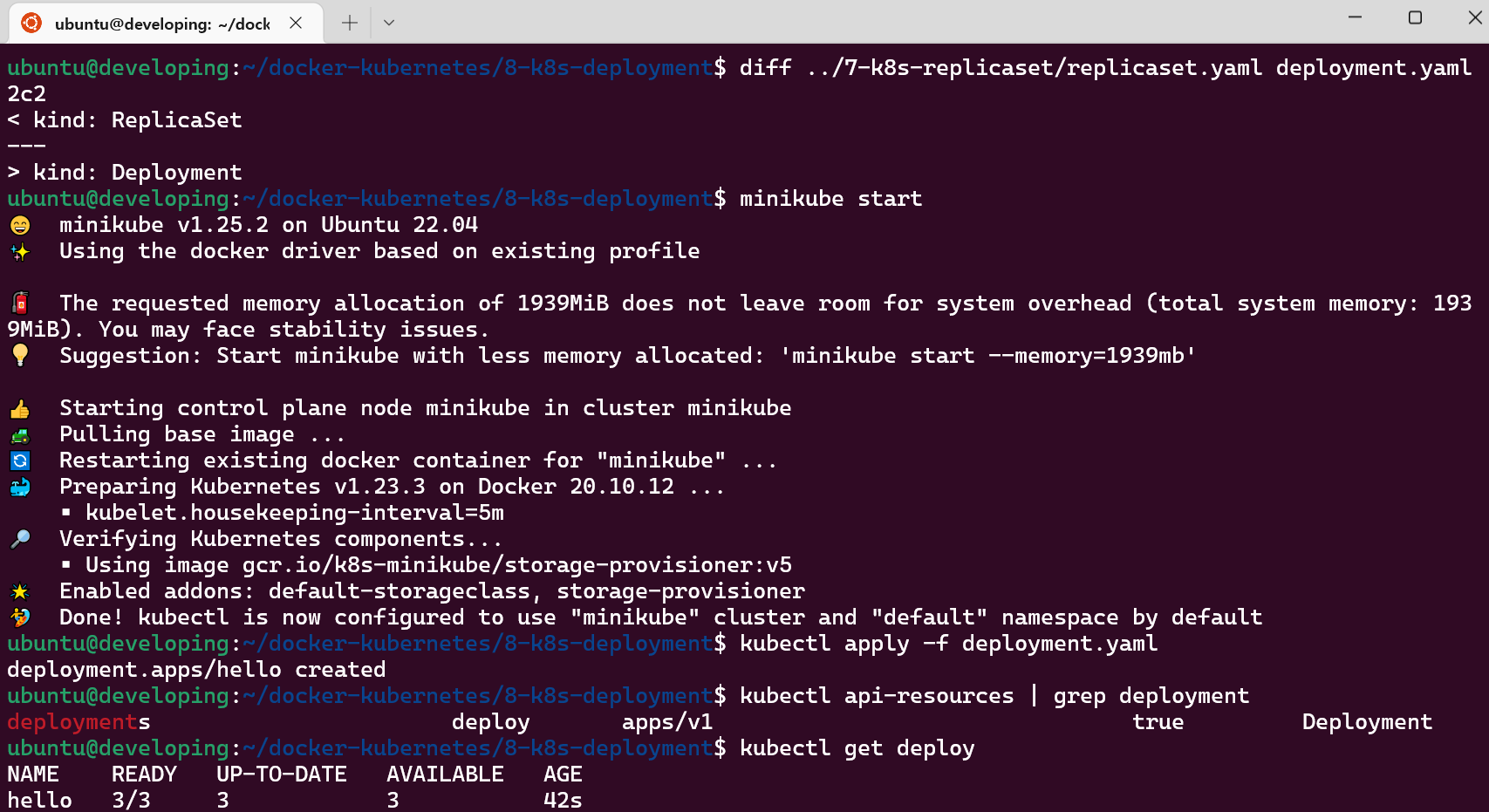 deployment.yaml과 replicaset.yaml과의 차이점은 단지 kind의 내용에서 api resource가 다르게 적용이 되었음을 확인할 수 있다.