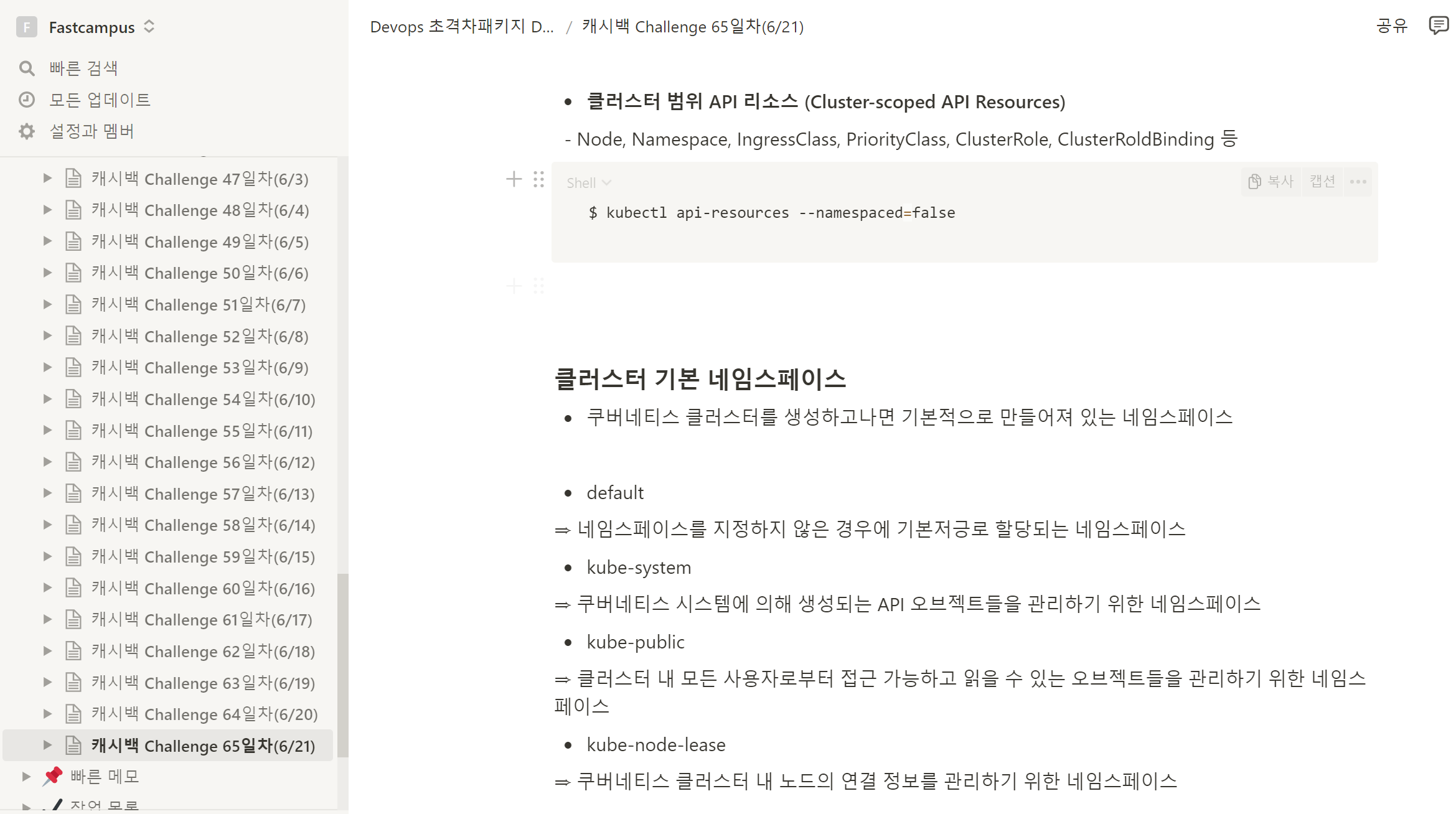 Namespace API Resource와 관련된 내용의 클립을 수강하는식으로 챌린지를 진행하였다. 드디어 내일이면 기나긴 챌린지의 끝이다! Namespace는 label처럼 분류기능뿐 아니라 권한관리나 리소스 제한 기능도 있음을 알게되었다. 다음 포스팅으로는 Job/CronJob 과 관련된 내용을 포스팅할 예정이다.