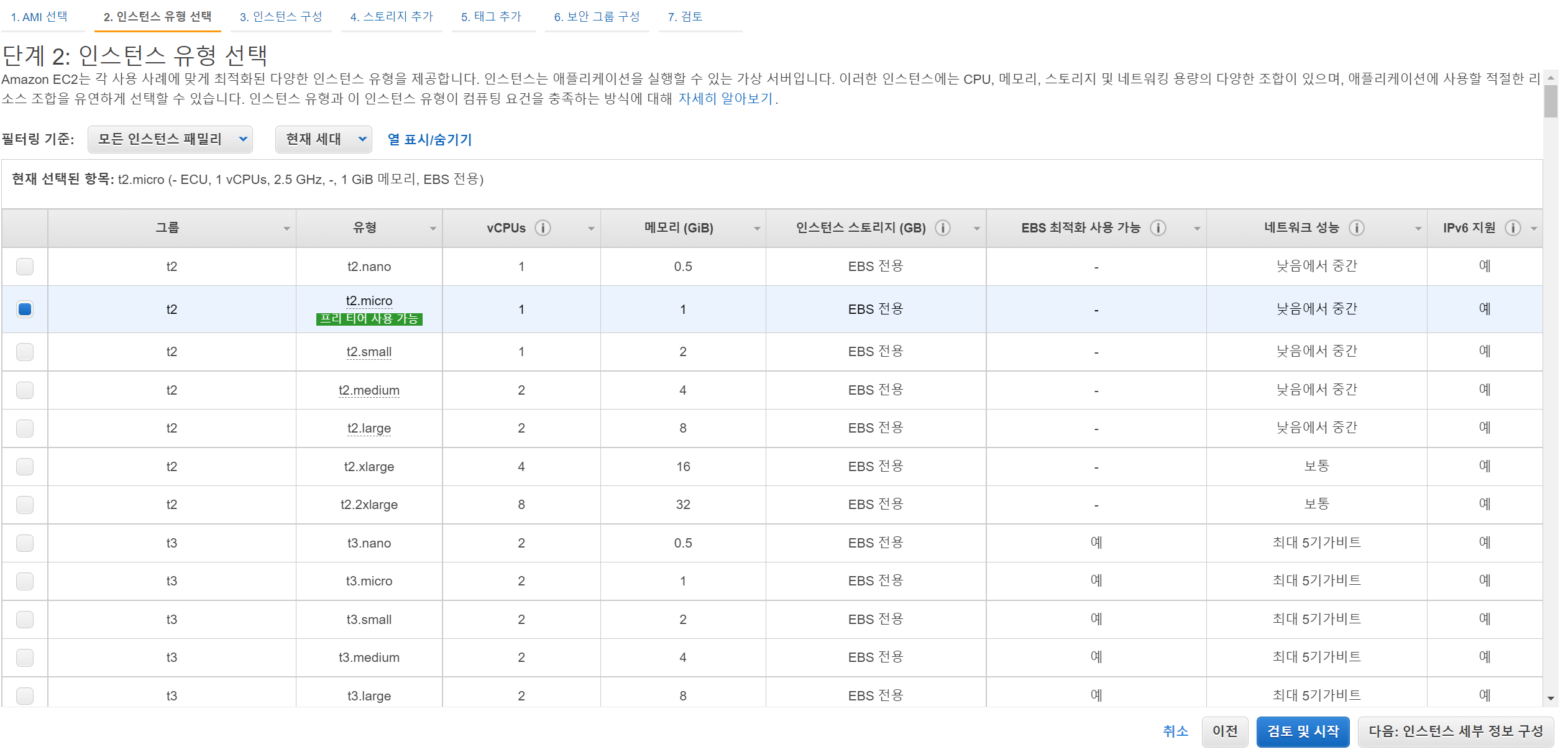 t2 micro를 선택해준다.