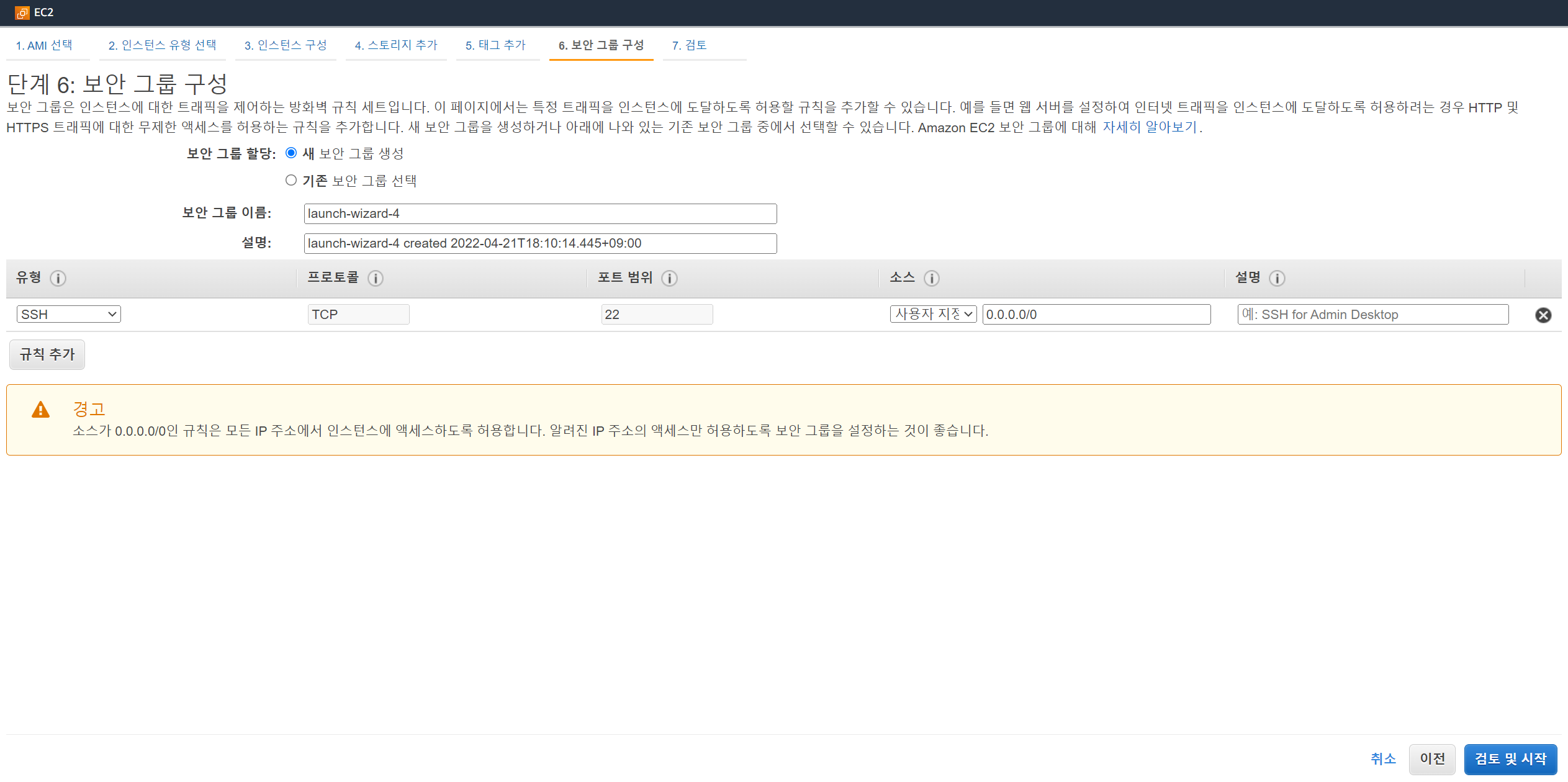 실습상에서 하는 것이 아닌 실무에서는 절대 0.0.0.0/0 (모든 IP대역에 대해서 open) 으로 설정하지는 않는다.