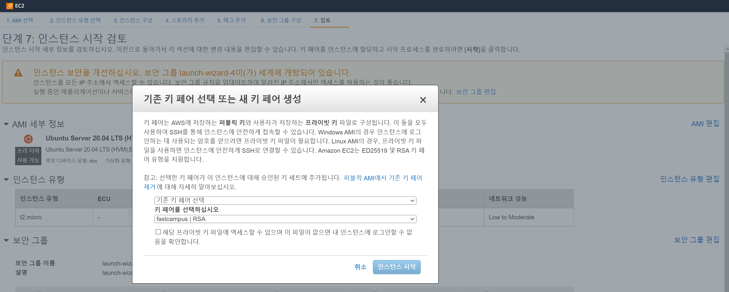 앞서 생성하였던 키 페어에 대해서 설정해주고, 인스턴스를 생성해주면 된다.