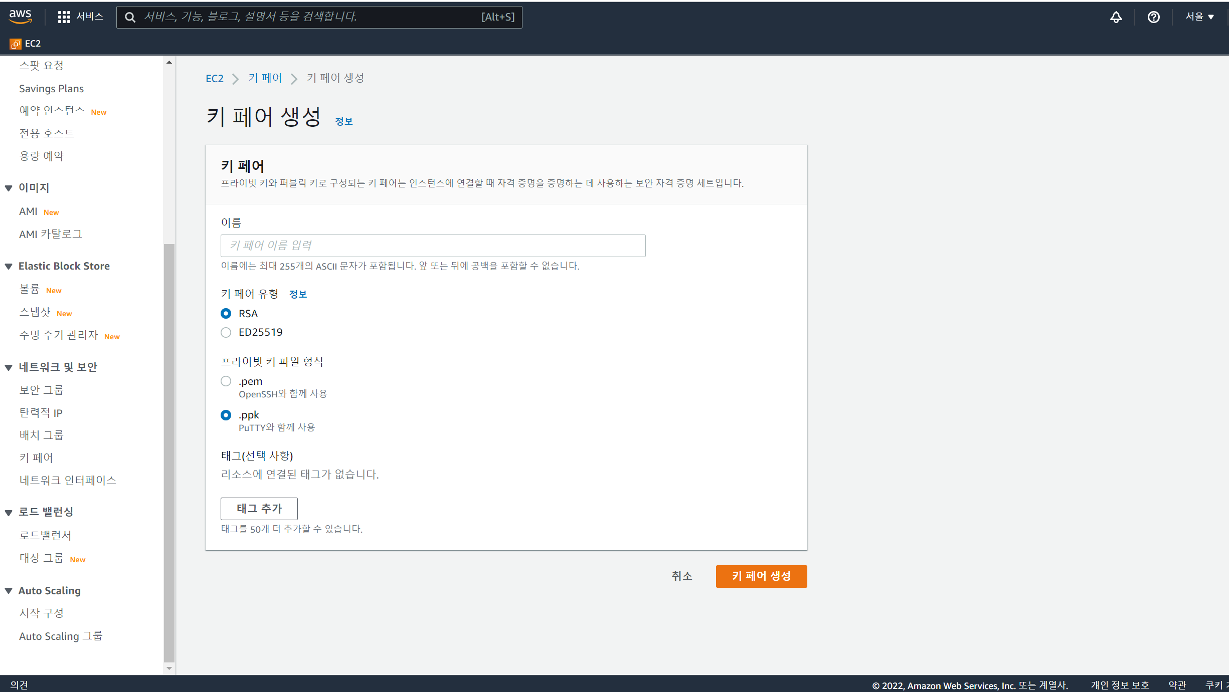 EC2 화면 진입 후 왼쪽 목차에서 키 페어를 선택해 생성페이지로 들어갈 수 있다.