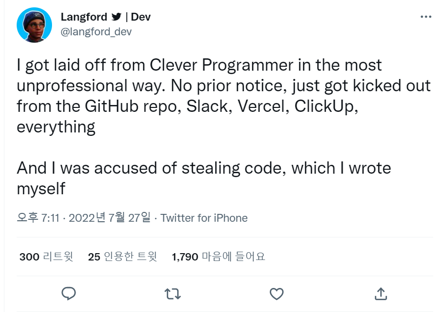 2. Langford라는 개발자가 Clever Programmer에서 일하고 있었고, (링크드인 확인 : 2022년 3월 - 2022년 7월)