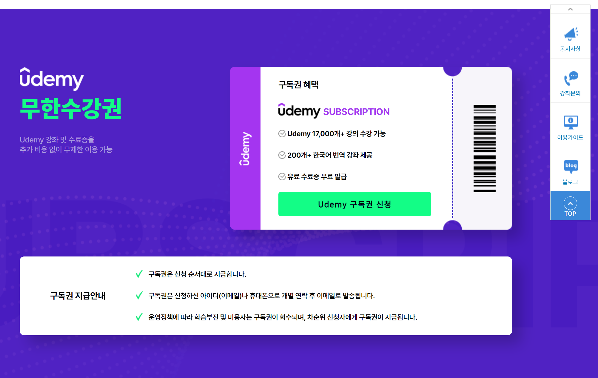 Udemy 강의를 무료로 구독할 수 있는 엄청난 혜택을 Kmooc에서 받을 수 있다. 단순히 메일등을 입력하면 며칠내에 Udemy Business 계정을 부여받아 자신이 원하는 강좌를 무료로 수강할 수 있게된다.